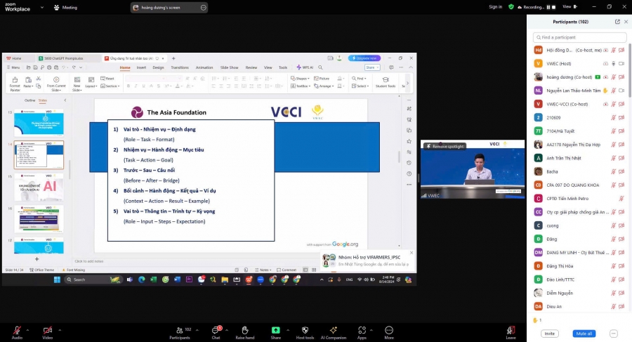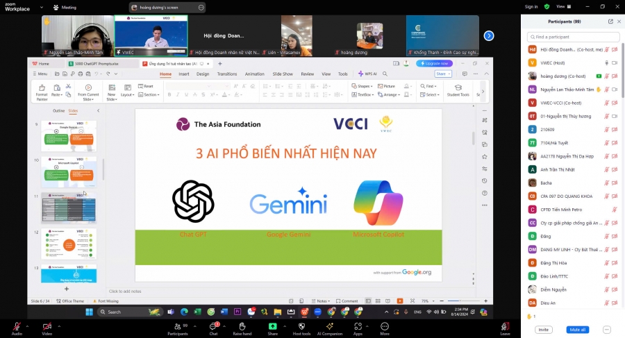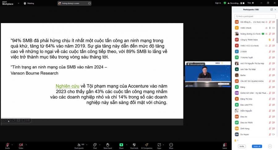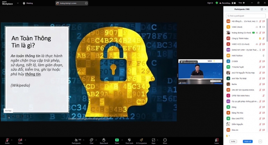 Ngày 14/08/2024, khóa đào tạo trực tuyến về “Ứng dụng trí tuệ nhân tạo (AI) và An toàn thông tin” đã diễn ra thành công, thu hút sự tham gia của hơn 100 doanh nghiệp do phụ nữ làm chủ, lãnh đạo.