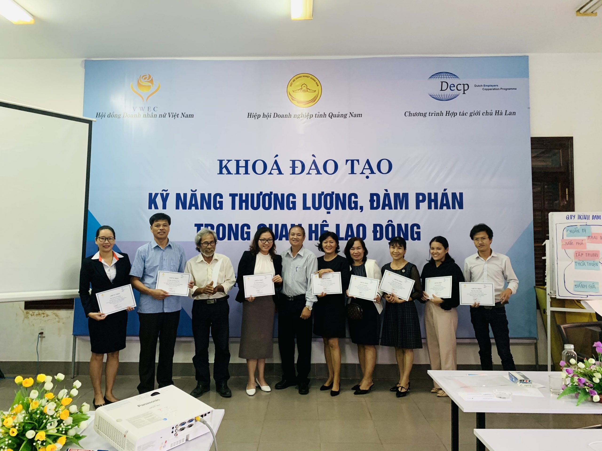 Ngày 15 tháng 12 năm 2020, trong khuôn khổ chương trình hợp tác giữa Hội đồng Doanh nhân nữ Việt Nam, Phòng Thương mại Công nghiệp Việt Nam và Chương trình hợp tác Giới chủ Hà Lan (DECP), Hội đồng Doanh nhân nữ Việt Nam đã phối hợp với Hiệp hội doanh nghiệp tỉnh Quảng Nam tổ chức khoá đào tạo “Kỹ năng đàm phán, thương lượng trong quan hệ lao động” cho các hội viên của Hiệp hội DN tỉnh Quảng Nam. Khóa đào tạo đã giúp các DN bổ sung kiến thức và kỹ năng về đàm phán và đối thoại tại nơi làm việc, góp phần hoàn thiện mối quan hệ lao động hài hoà, từ đó giúp nâng cao năng suất và thu nhập, thúc đẩy sự phát triển của DN.